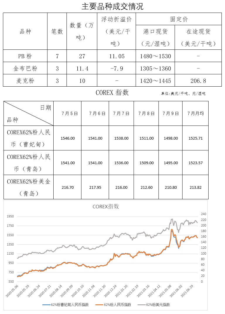 7月5日-7月9日成交20筆共53.4萬(wàn)噸,其中在途3筆34萬(wàn)噸,港口17筆19.4萬(wàn)噸。